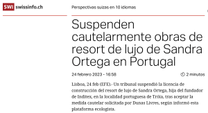 Swiss Info Espanha, 24 de Fevereiro de 2023 Lisboa, 24 feb (EFE).- Un tribunal suspendió la licencia de construcción del resort de lujo de Sandra Ortega, hija del fundador de