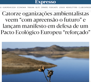Carla Tomás 27 de Junho de 2024 – Expresso Catorze oganizações ambientalistas veem “com apreensão o futuro” e lançam manifesto em defesa de um Pacto Ecológico Europeu “reforçado” Com as