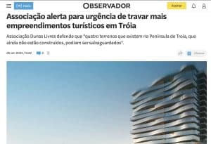 Observador 26 de Setembro de 2024 – Observador Associação Dunas Livres defende que “quatro terrenos que existem na Península de Troia, que ainda não estão construídos, podiam ser salvaguardados”. Uma